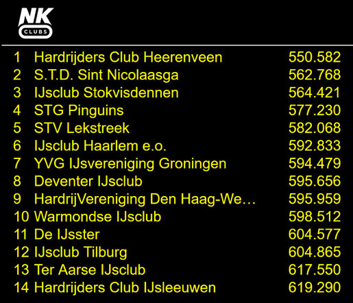 De zevende editie van het NK Clubs is een prooi geworden voor HCH Heerenveen. De Friese vereniging hield met een puntentotaal van 550.582 S.T.D. Sint Nicolaasga en IJsclub Stokvisdennen achter zich. Voor HCH was het de vijfde titel op rij.